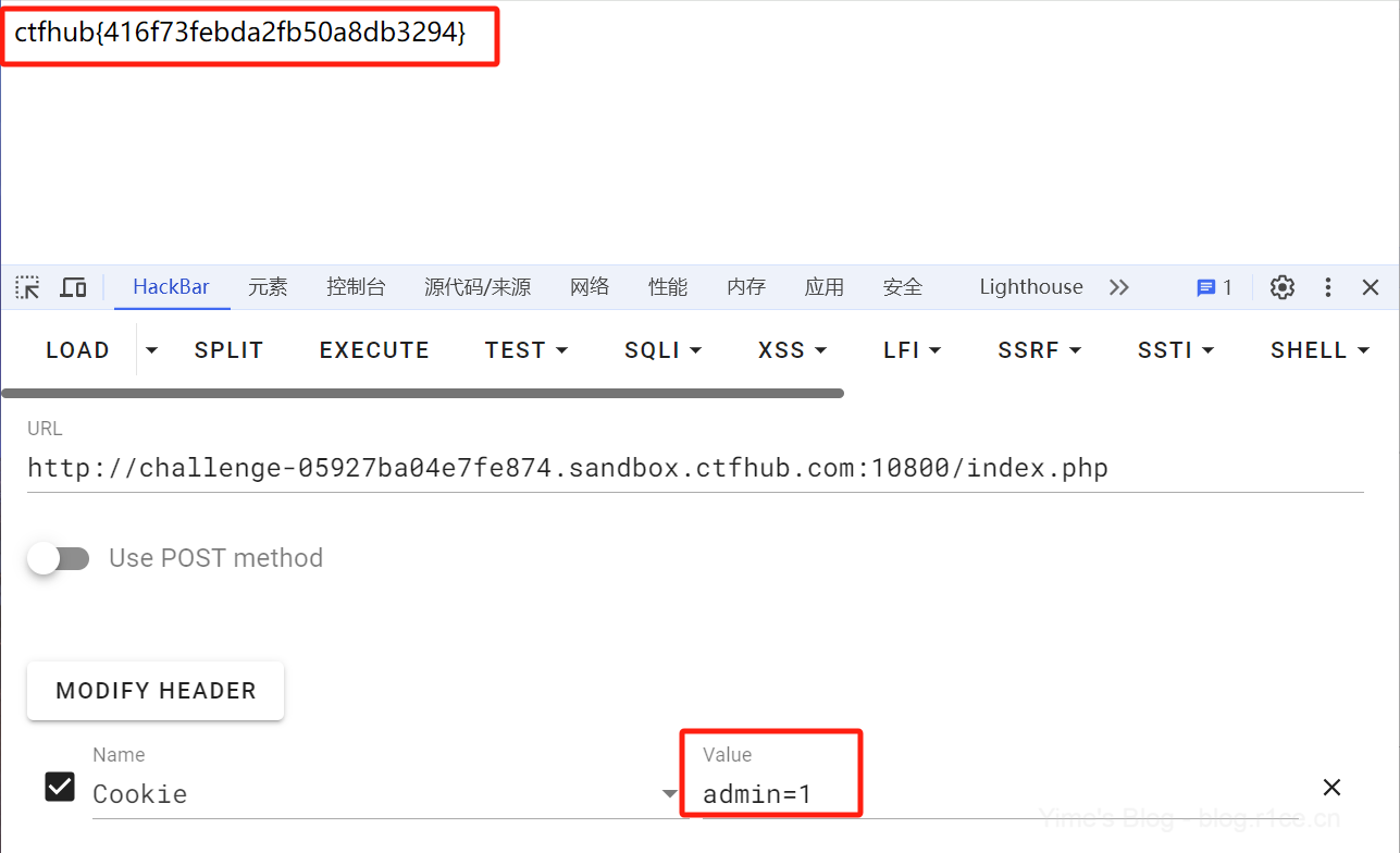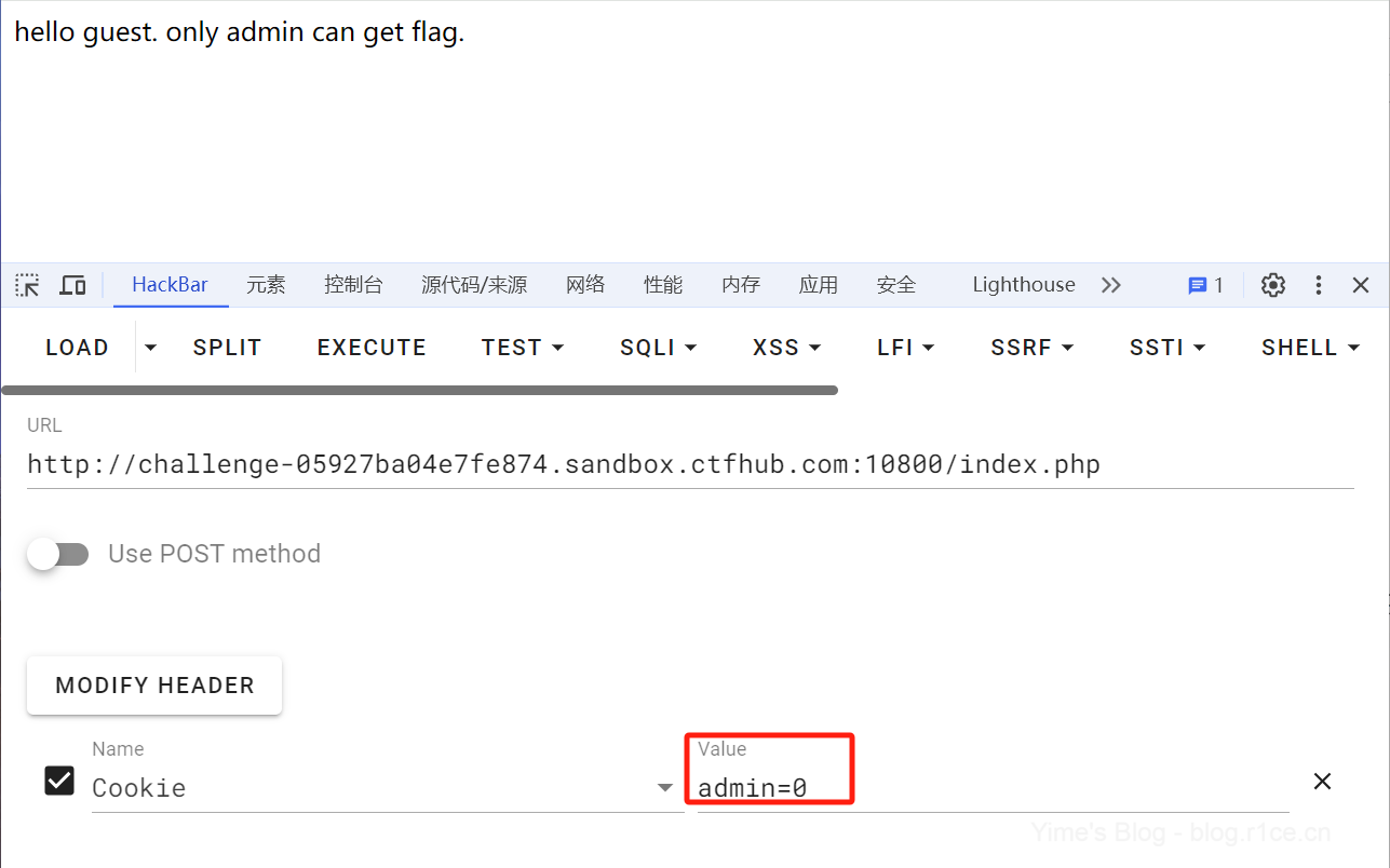 使用HackBar加载index.php页面,发现存在Cookie信息admin=0。
