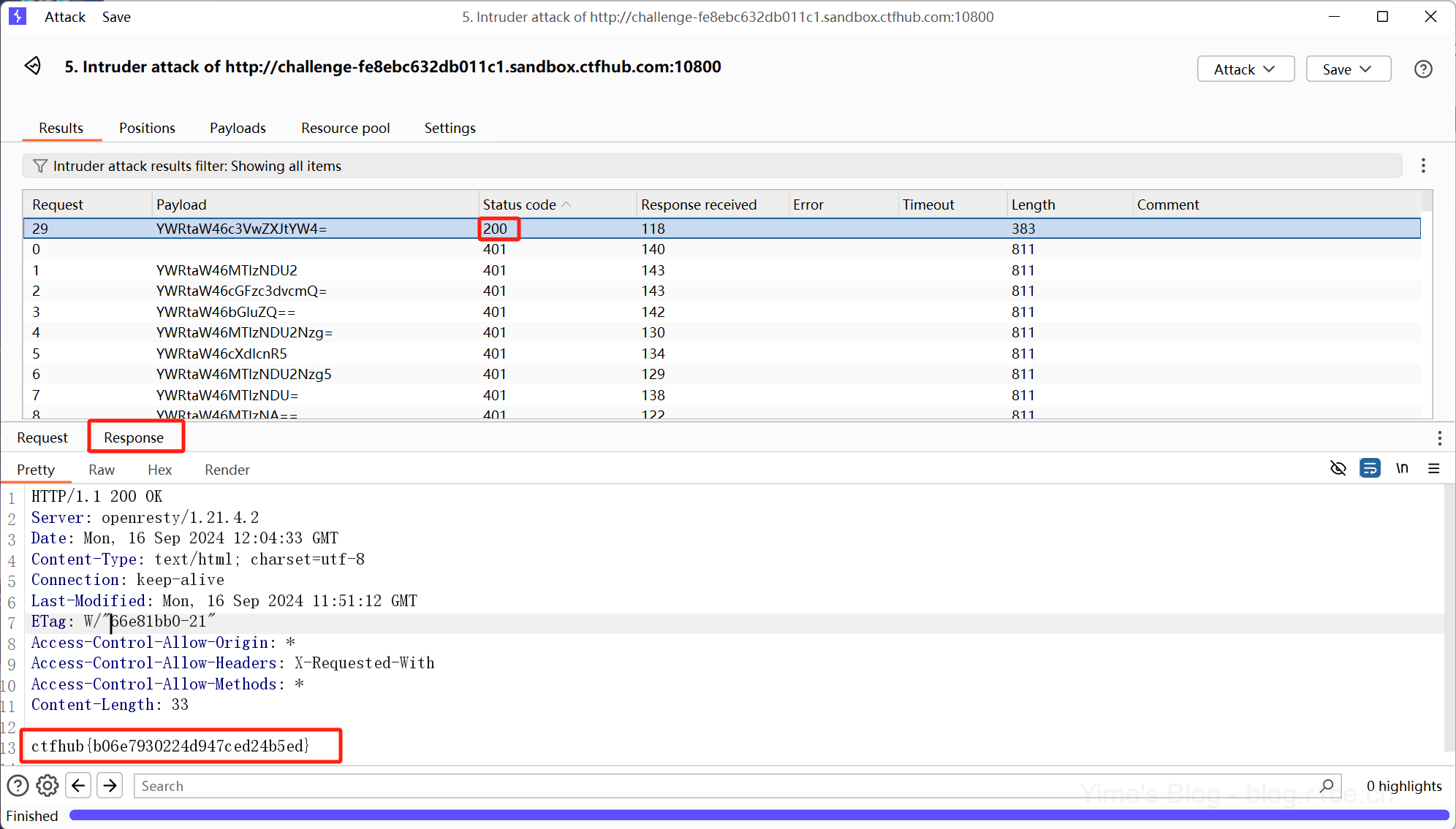 攻击结束后筛选状态码,找到状态码为200的请求,查看响应包,获取到Flag。