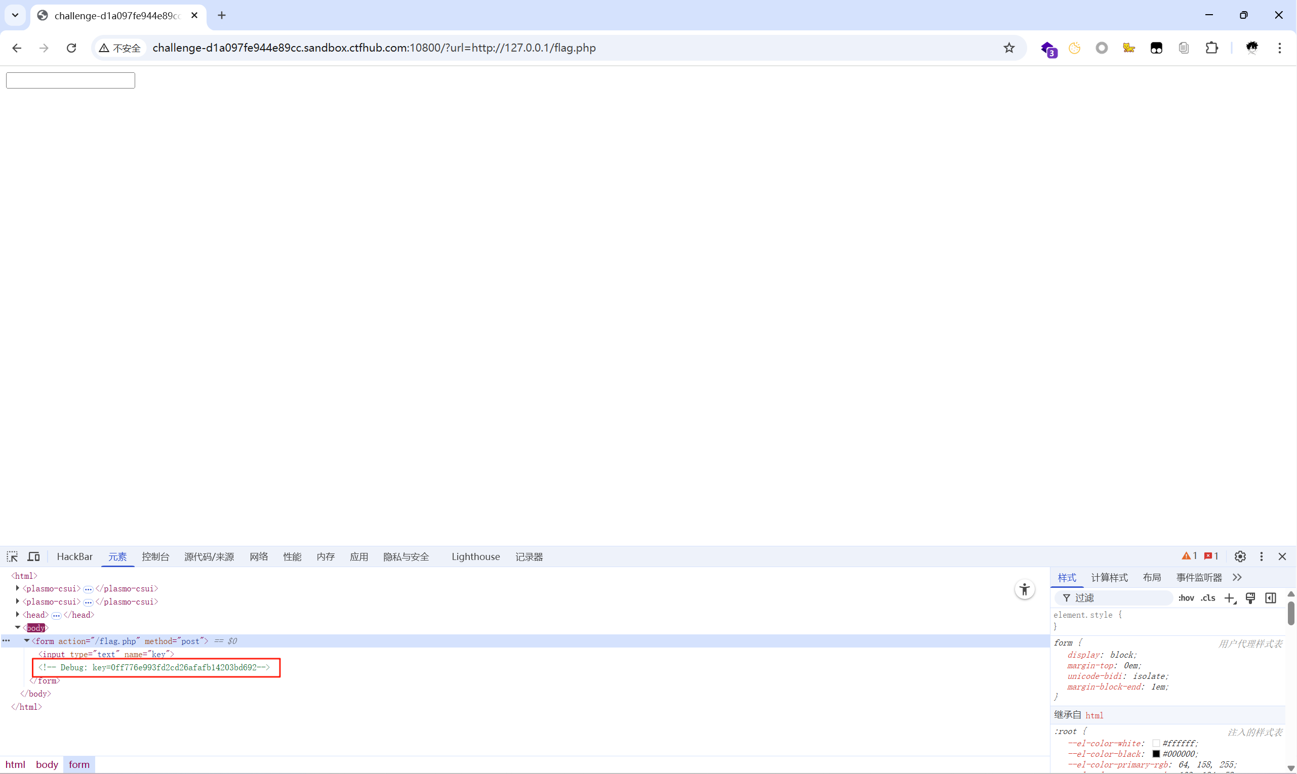 我们尝试访问 http://127.0.0.1/flag.php,发现成功跳转,并在页面源码中发现了一个 key,我们先复制下来这个 key。