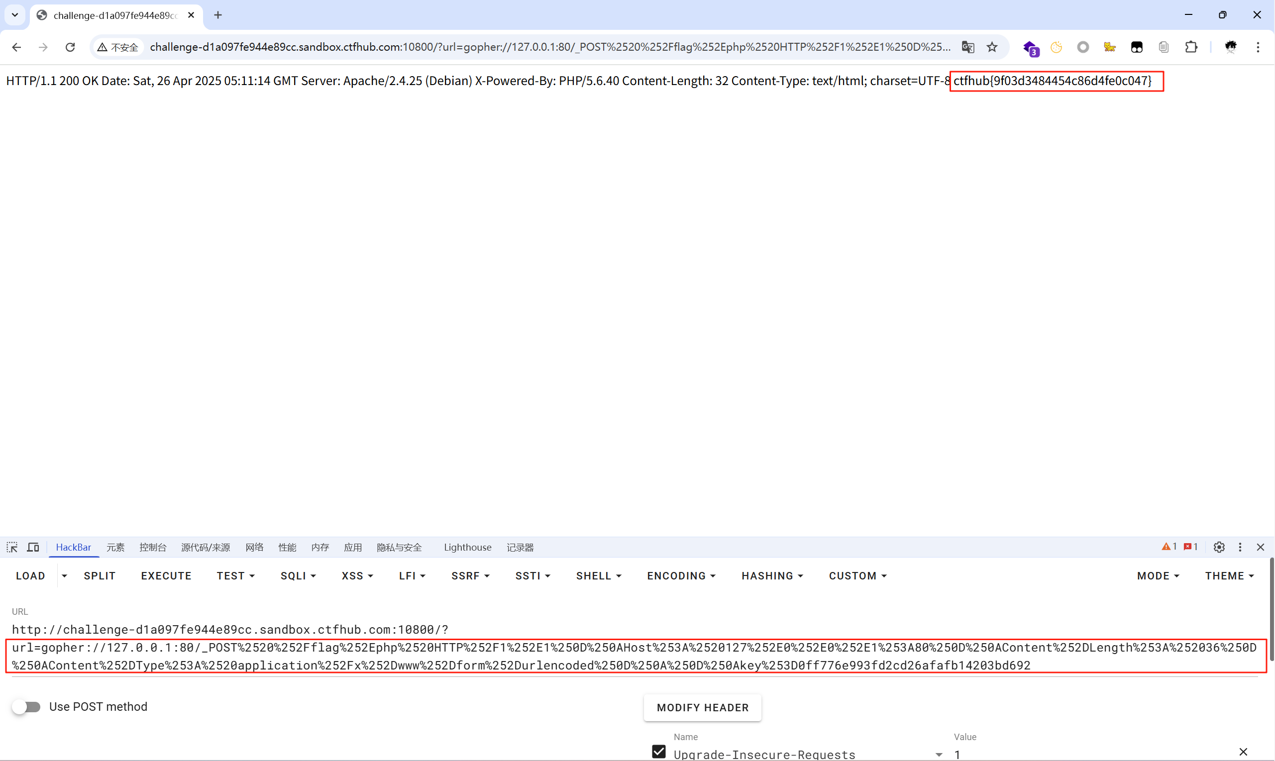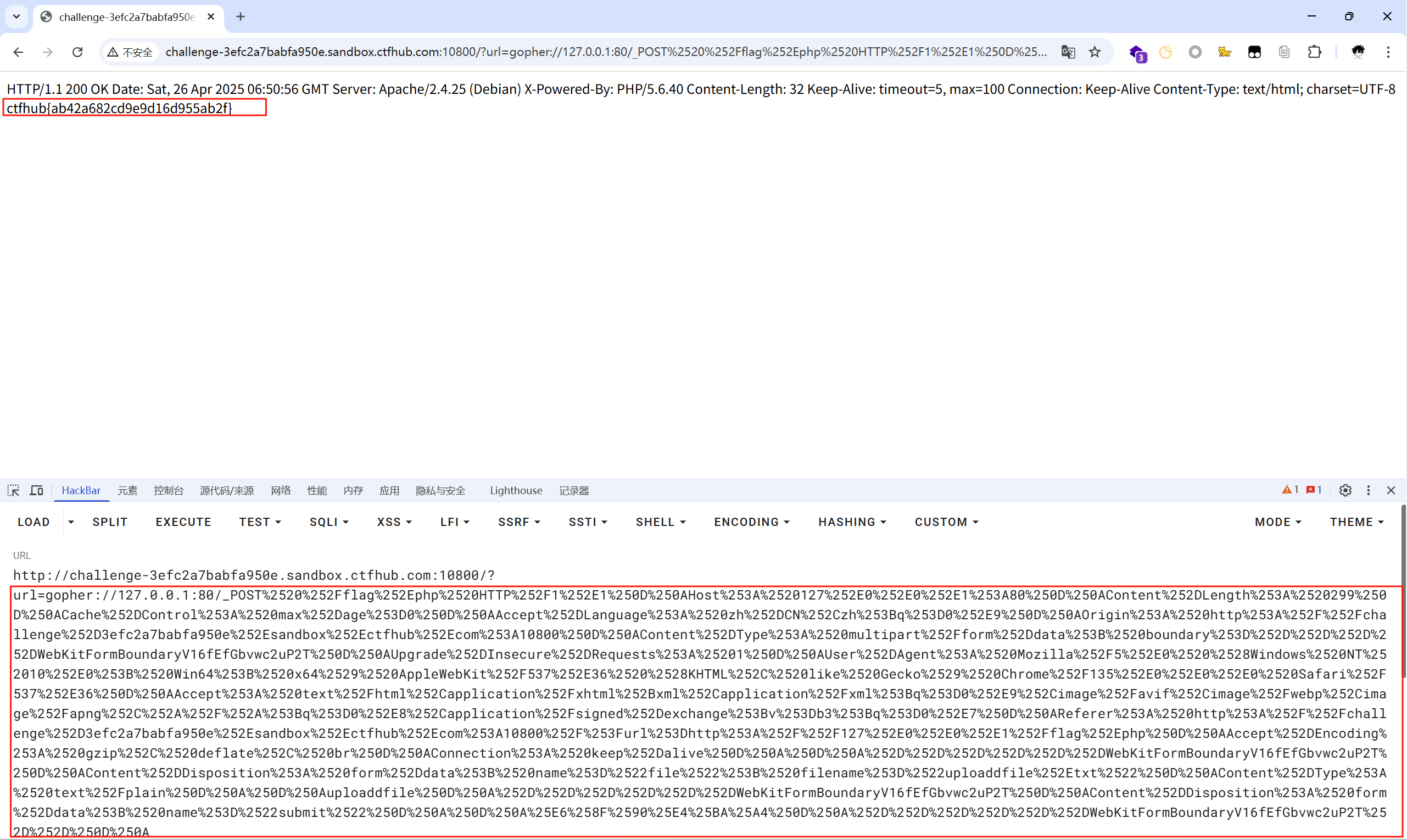 将编码后的请求包加上 gopher 协议发送,发现成功返回 flag。