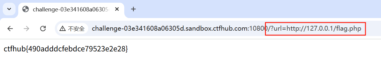 根据题目提示,要求访问位于 127.0.0.1 的 flag.php 文件,构造 url 地址 http://127.0.0.1/flag.php 在 url 后接此本地地址进行请求,成功获取 flag。
