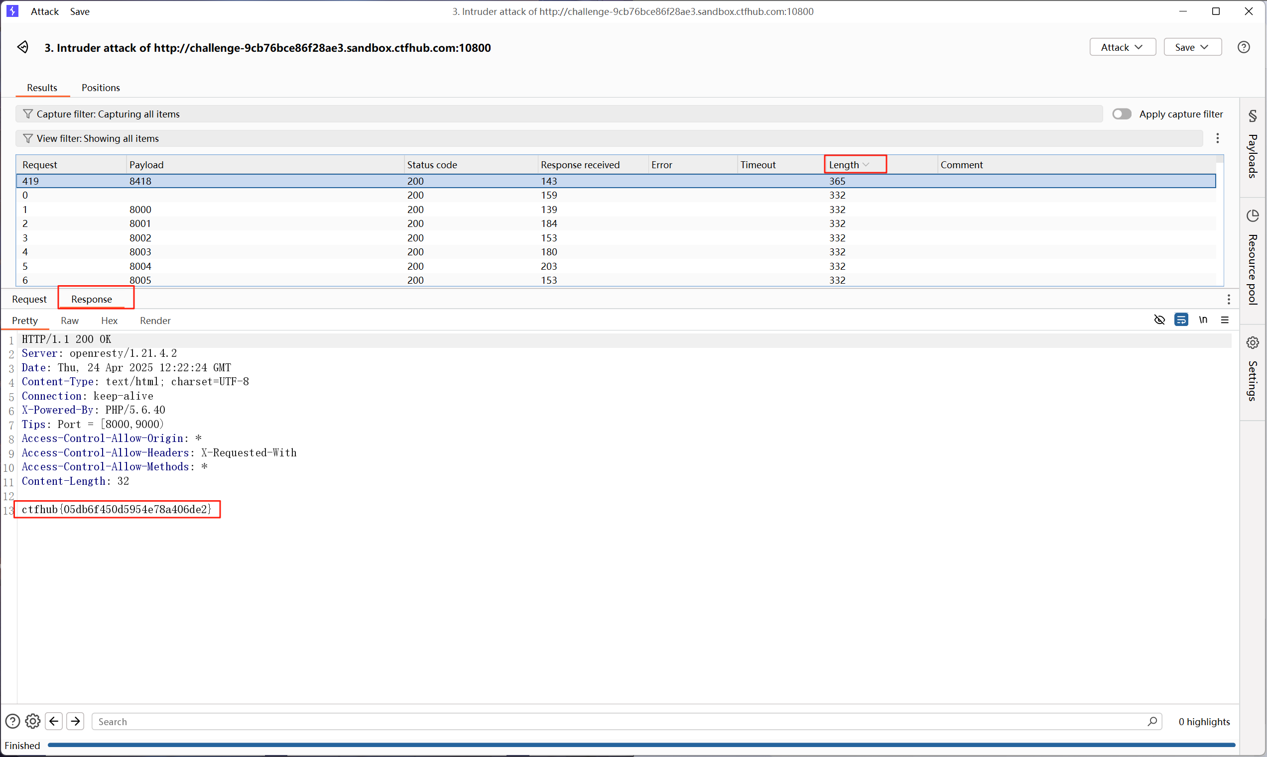 攻击完成后对响应包长度进行排序,找到长度最长的一个响应包,查看其相应体,发现存在 flag。