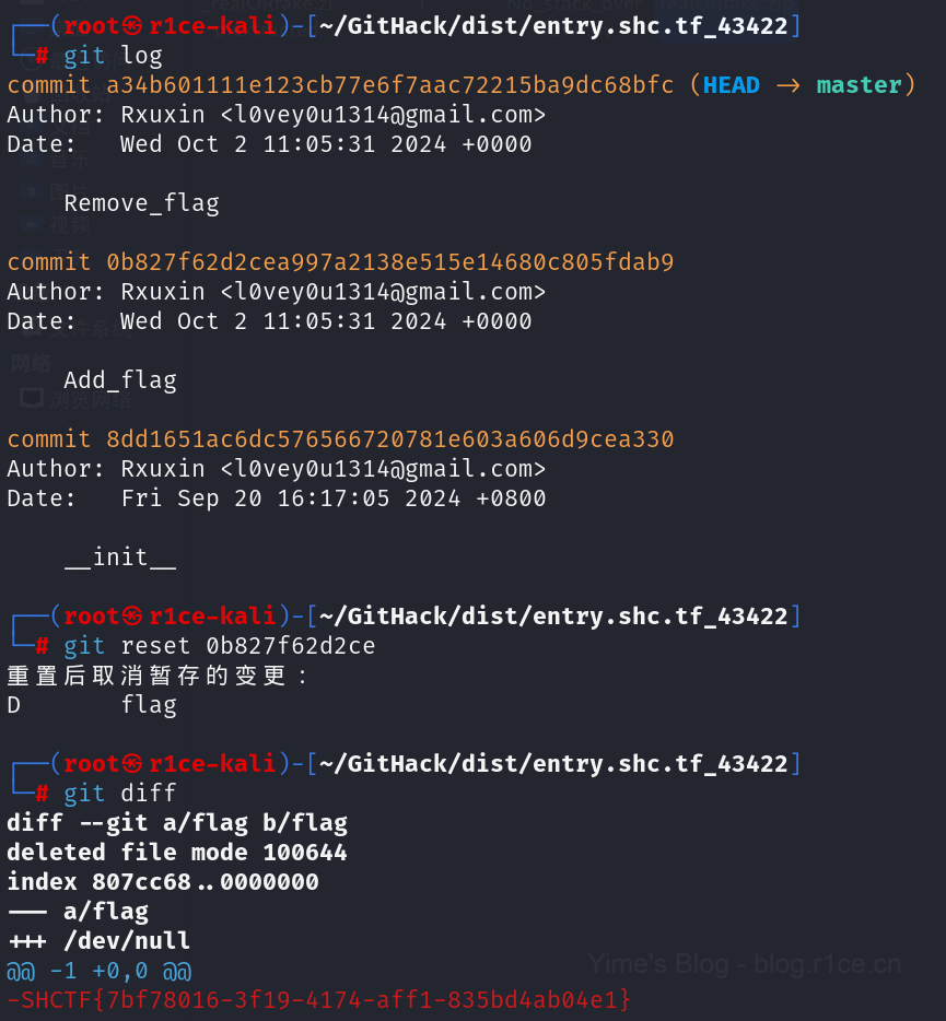 1 2 3 4 5 python2 GitHack.py http://entry.shc.tf:43422/.git/ cd /root/GitHack/dist/entry.shc.tf_43422git log git reset 0b827f62d2ce git diff