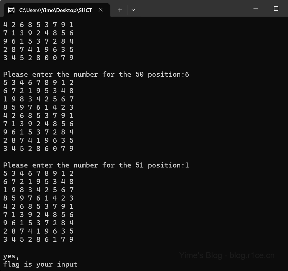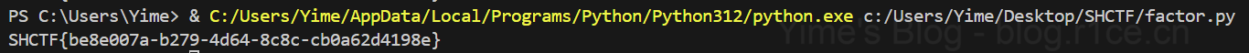 解题思路: 1 2 3 4 5 6 7 8 9 10 11 12 13 14 15 16 17 18 19 20 21 22 23 24 25 26 27 28 29 30 from itertools import combinationsfrom Crypto.Util.number import long_to_bytes, inversec = 102940964838881442811793470165637420986982369691872568484347596835680882875387059941542464171928604491996968653270082003450703399602110 e = 65537 prime_list = [ 12233656963230450497 , 13421947135234779269 , 13895334327577178233 , 14985742269205870007 , 14989173909614755127 , 15673500350468511359 , 16448422477222230811 , 16530748548848239561 , 17313131725492469309 , 18115542312494777713 ] for subset in combinations(prime_list, 7 ): n = 1 for prime in subset: n *= prime phi_n = 1 for prime in subset: phi_n *= (prime - 1 ) try : d = inverse(e, phi_n) m = pow (c, d, n) flag = long_to_bytes(m) if flag.startswith(b'SHCTF' ): print (flag.decode()) break except ValueError: continue