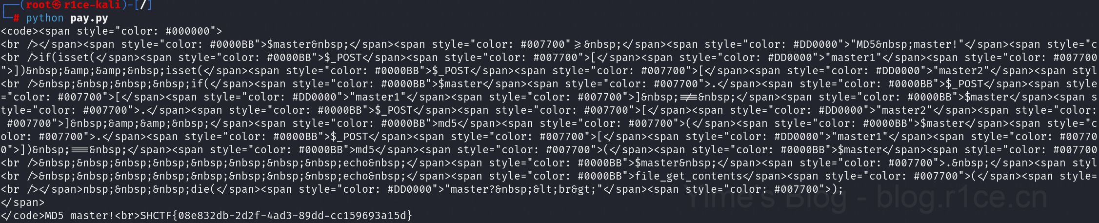 1 2 3 4 5 6 7 8 9 10 11 12 13 14 15 16 17 18 19 20 import requestsfile1_path = './1.txt' file2_path = './2.txt' try : with open (file1_path, 'rb' ) as file1: master1_content = file1.read() with open (file2_path, 'rb' ) as file2: master2_content = file2.read() except FileNotFoundError as e: master1_content = str (e) master2_content = str (e) url = 'http://210.44.150.15:40046/' data = {'master1' : master1_content, 'master2' : master2_content} response = requests.post(url, data=data) print (response.text)