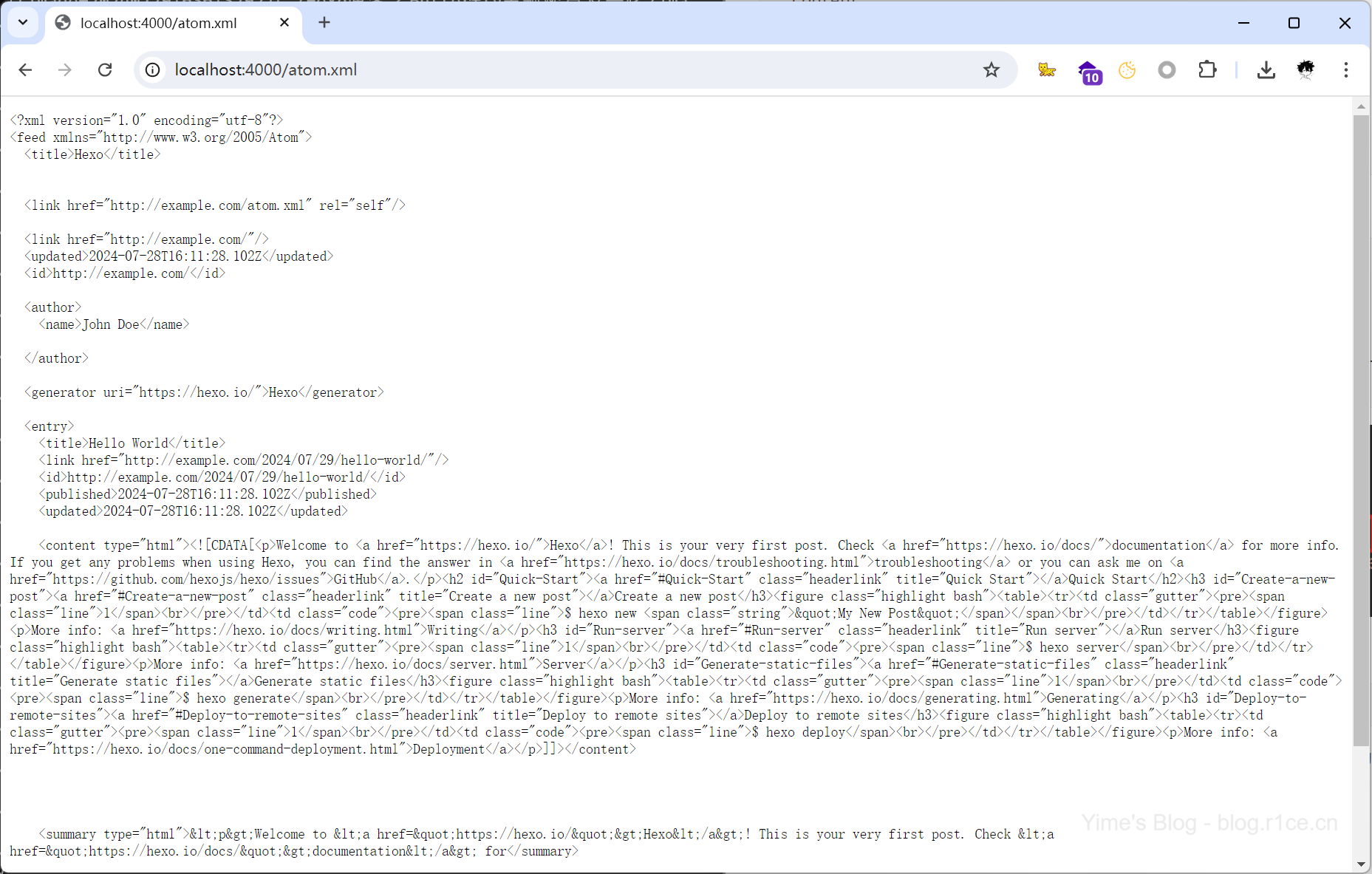 打开浏览器访问http://localhost:4000/atom.xml链接,显示以下相似内容即为成功。
