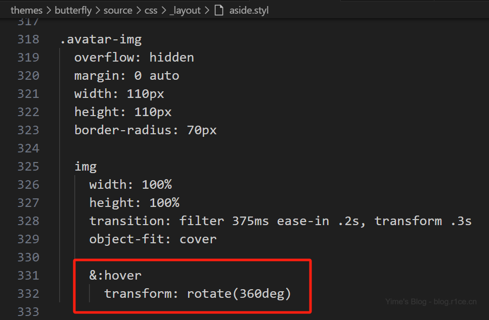 打开[博客目录]\themes\butterfly\source\css\_layout\aside.styl这个文件,将.avater-img中的以下内容进行删除