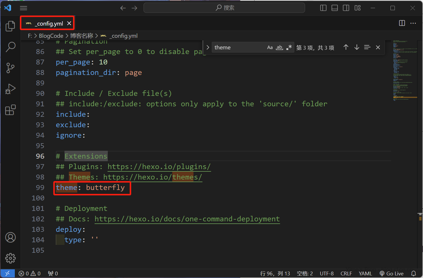 使用Visual Studio Code或者其他编辑器打开博客项目根目录中的_config.yml文件。