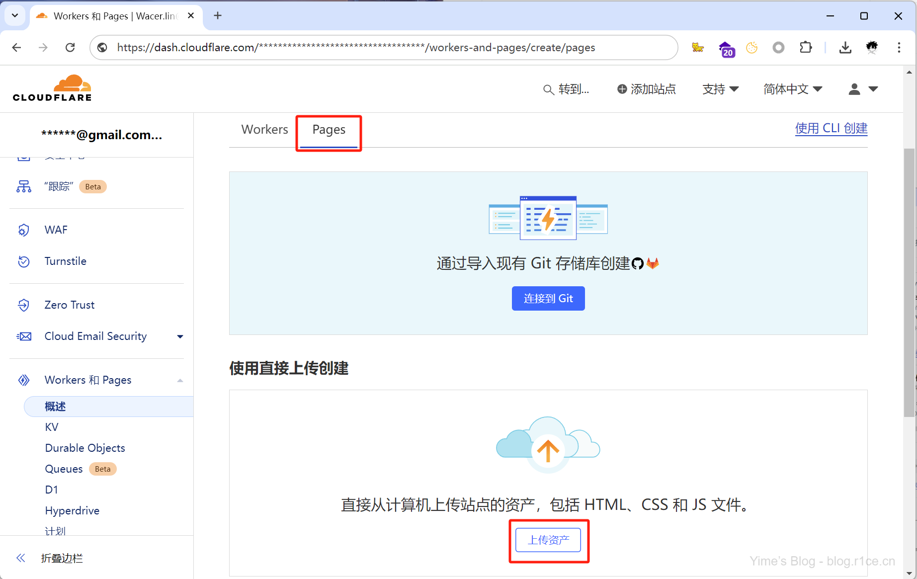 在新跳转的页面中选中Pages,然后点击下方的上传资产。