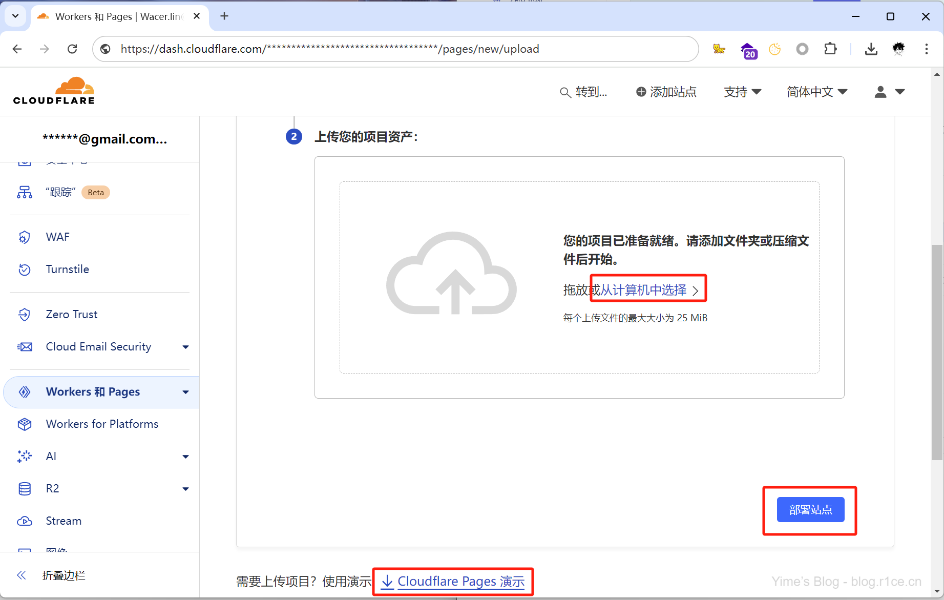 然后将他下方的演示文件下载下来先传上去,然后点击部署站点。