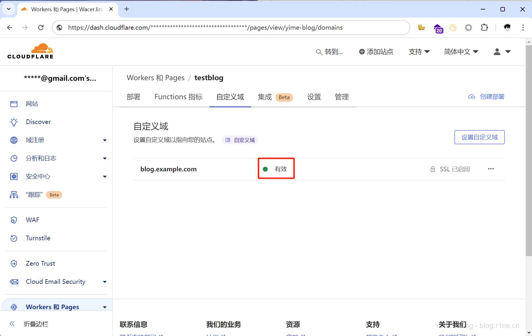 添加完成后,等待一阵DNS解析刷新,显示如下则表示自定义域已经配置成功:
