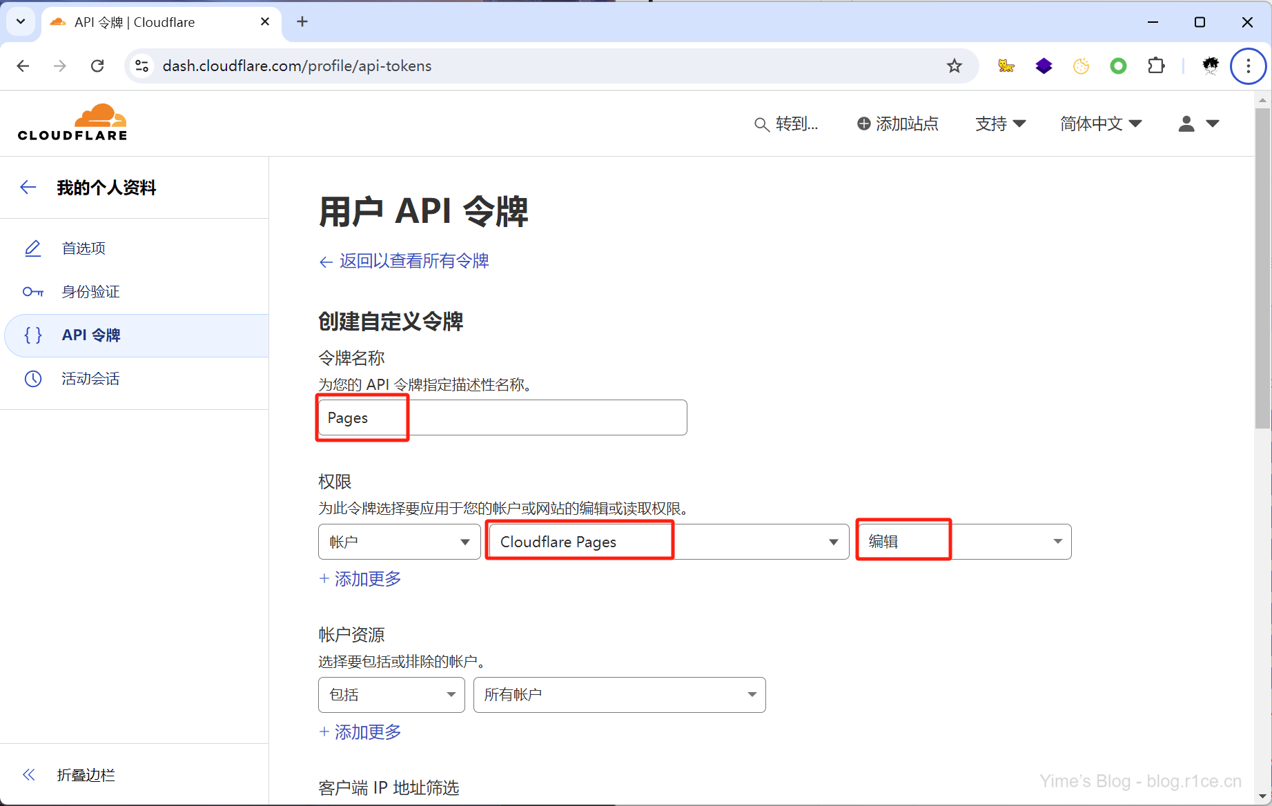 在跳转到的创建自定义令牌页面中,填写自定义的令牌名称,将权限设置为账户→Cloudflare Pages→编辑,其他的默认即可,点击下方的继续以显示摘要。