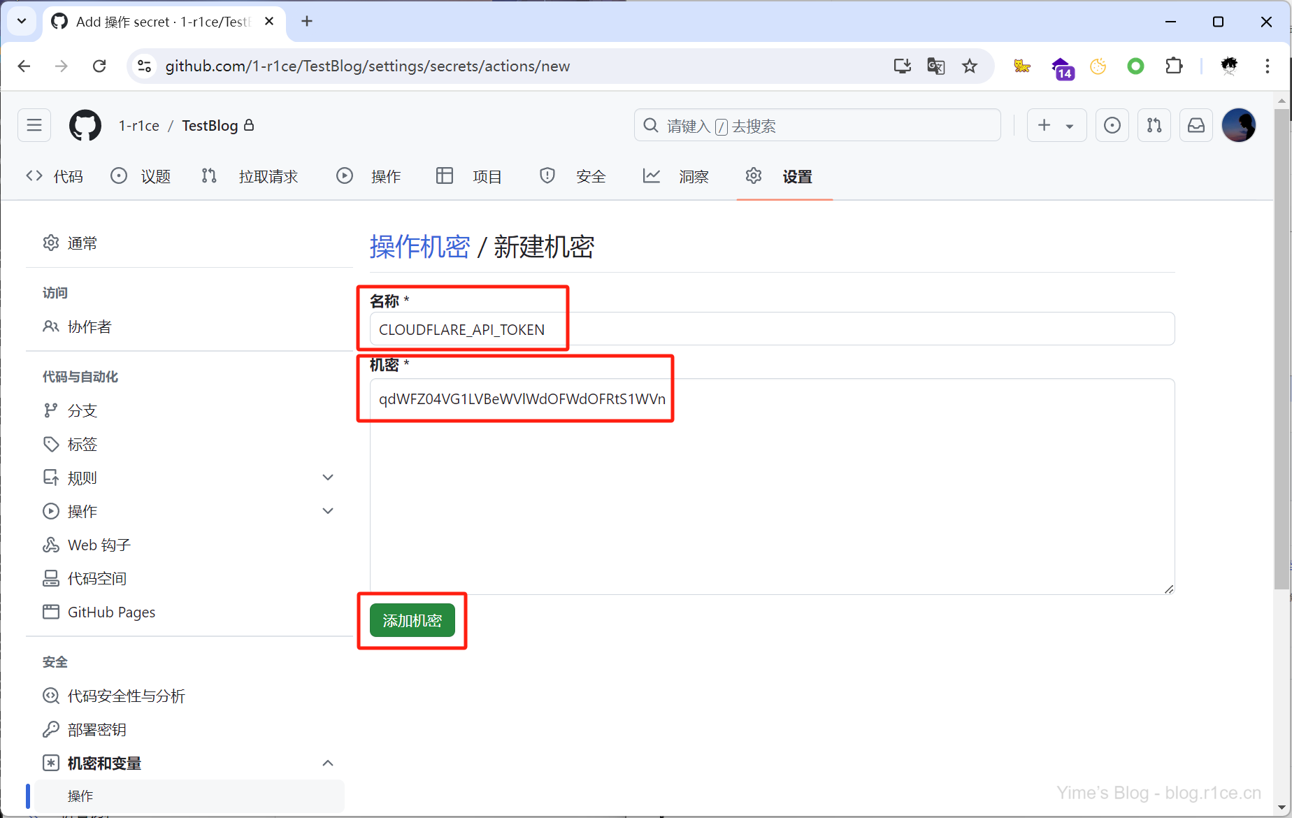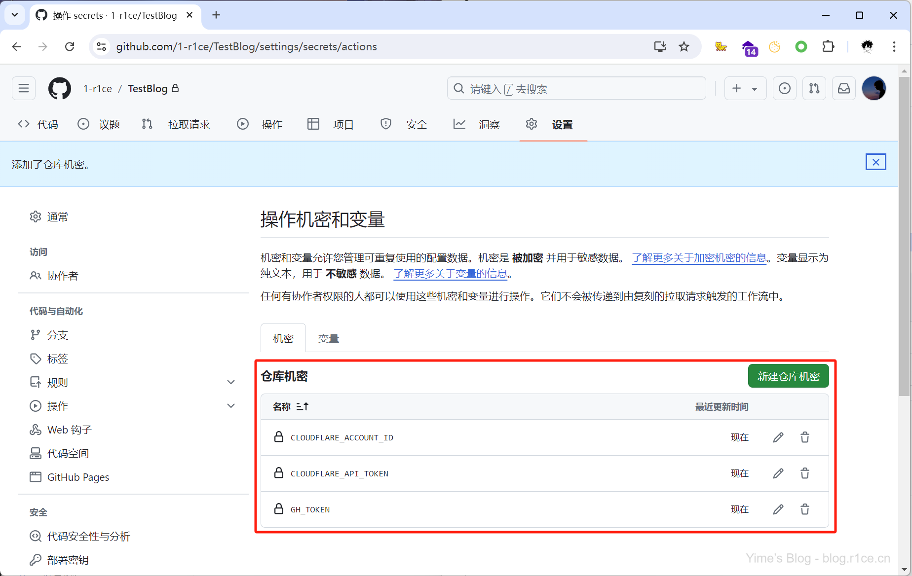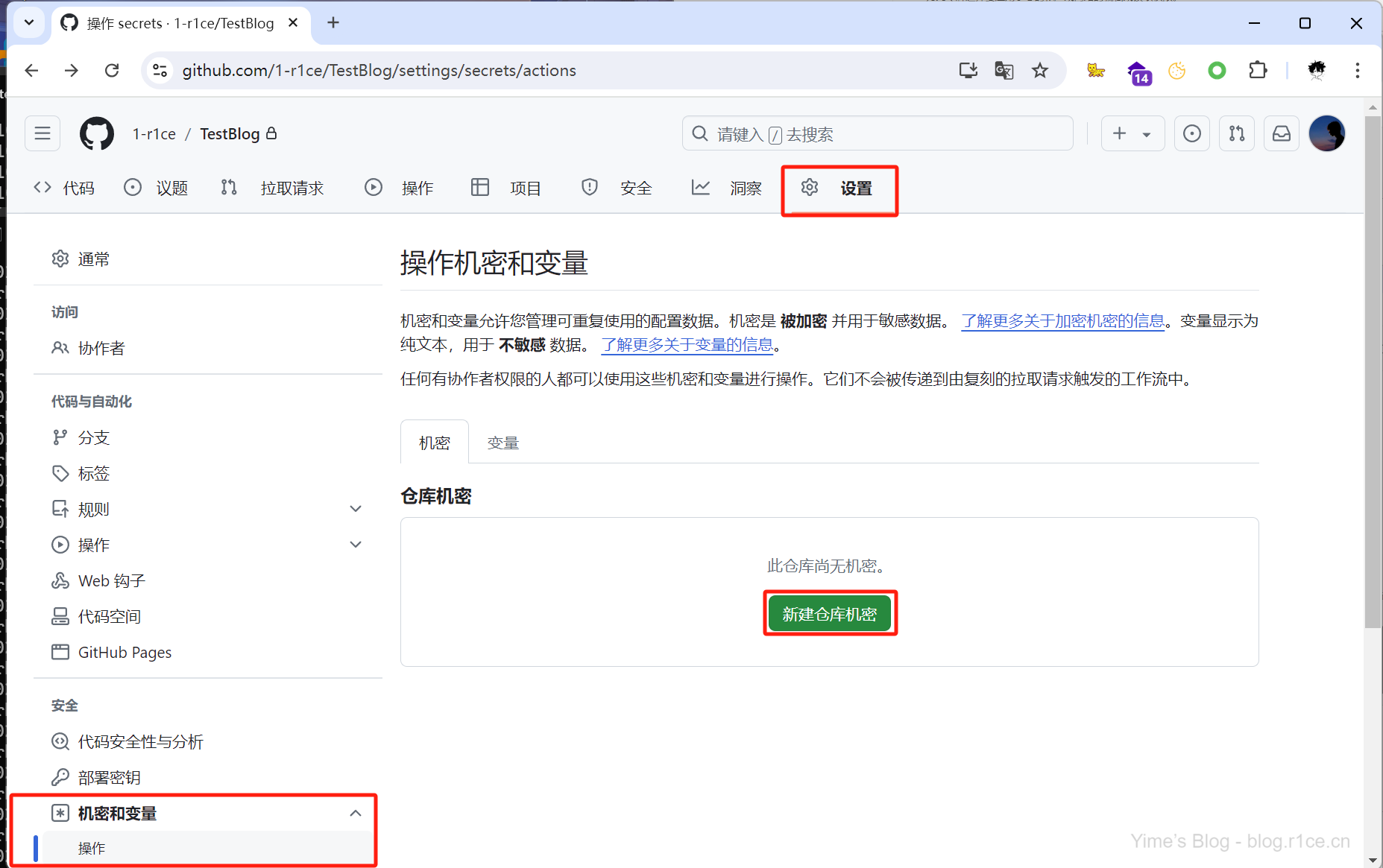 来到存放博客项目的Github仓库当中,点击设置、机密和变量、操作、新建仓库机密