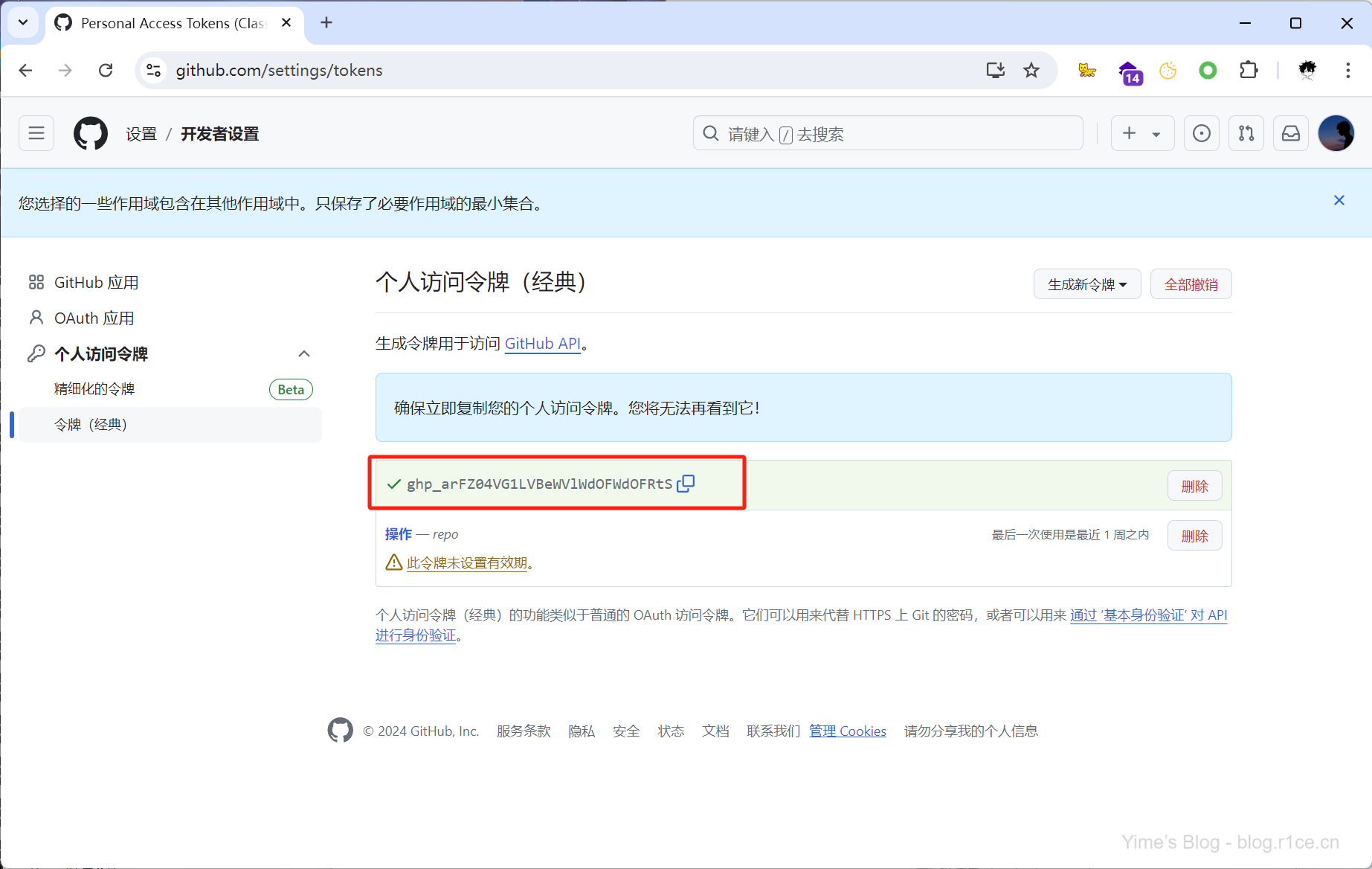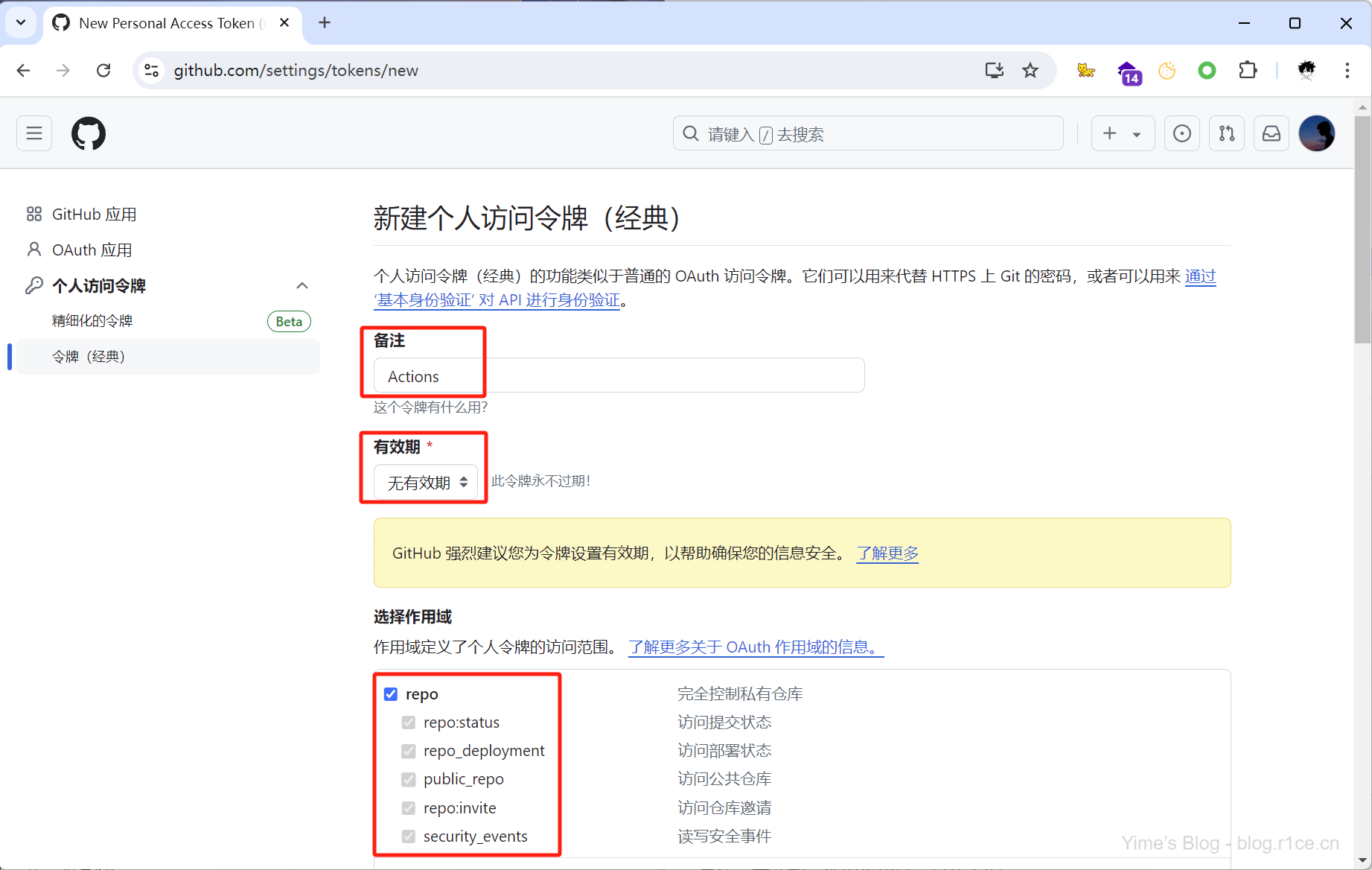 在跳转到的新建个人访问令牌(经典)界面,修改以下内容: