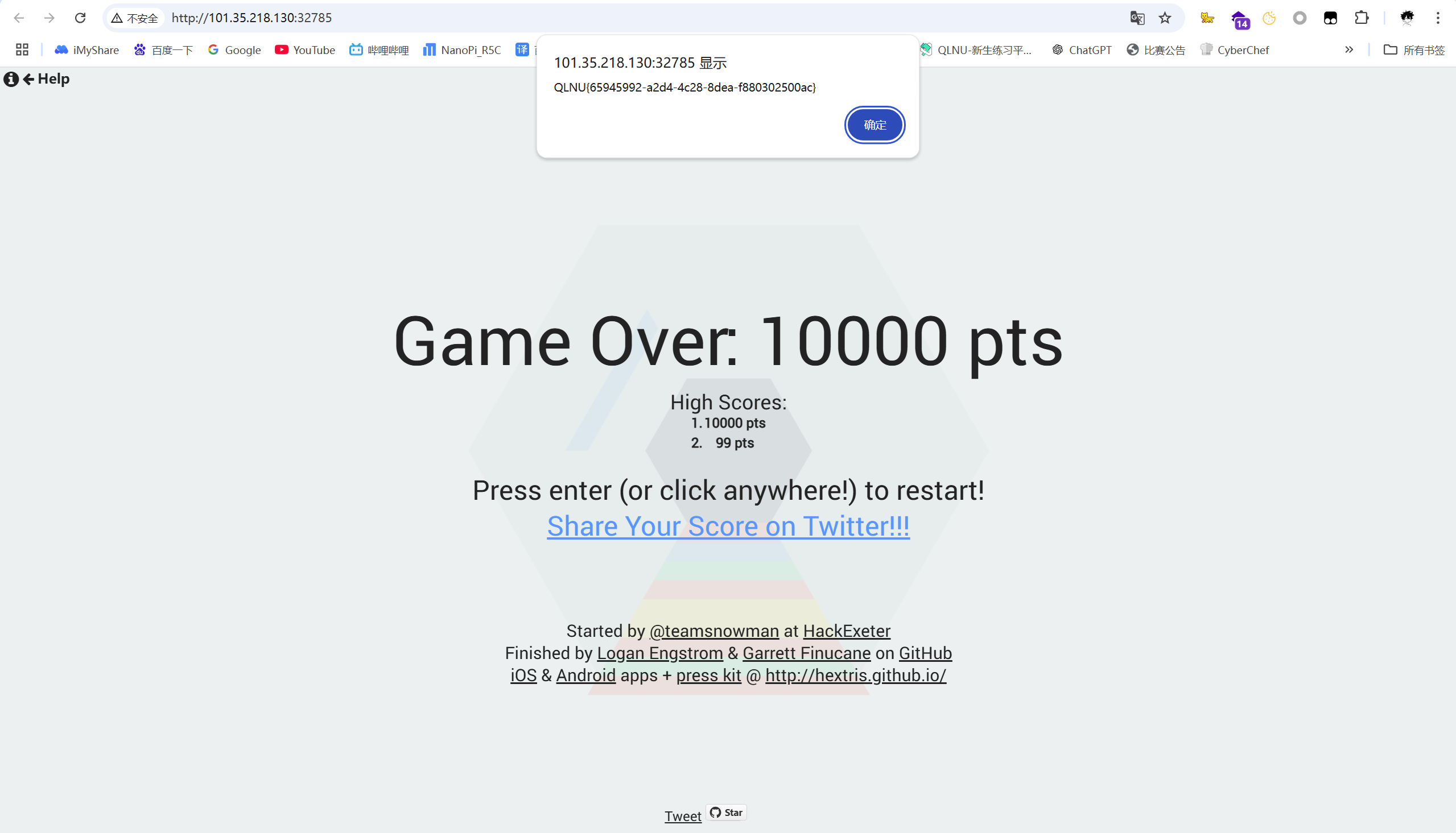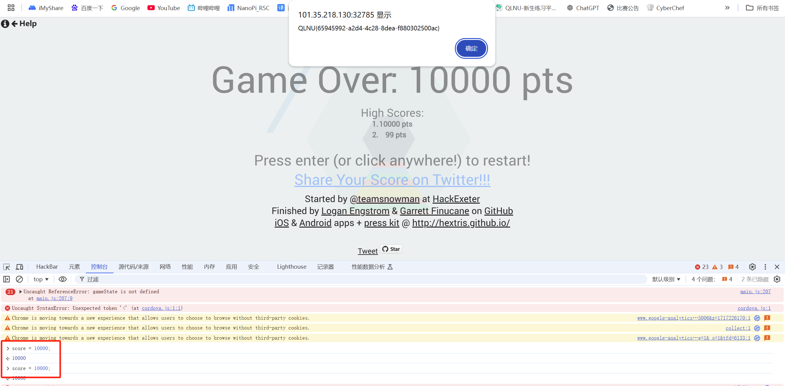 当游戏结束时,score 大于 10000,即可获得 flag。
