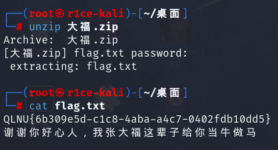 使用之前获得的压缩包密码解压大福学长,即可获得 flag。