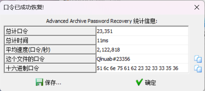 按照此正则,对压缩包进行掩码攻击,即可获得压缩包密码“Qlnuab#23356”。